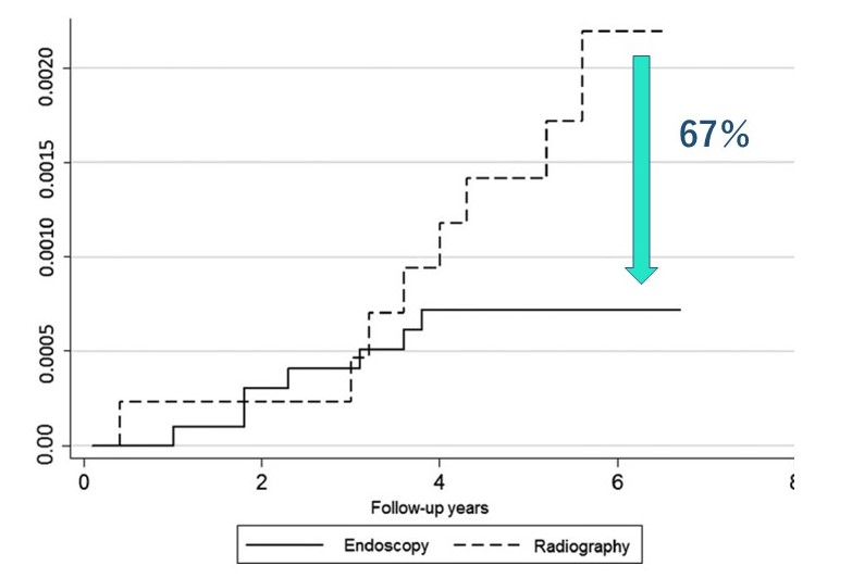 ある研究では、胃カメラ(内視鏡)によるスクリーニングが、バリウム検査と比較して胃がんによる死亡率を67%も減少させるという結果が示されました(https://pubmed.ncbi.nlm.nih.gov/26432528/)